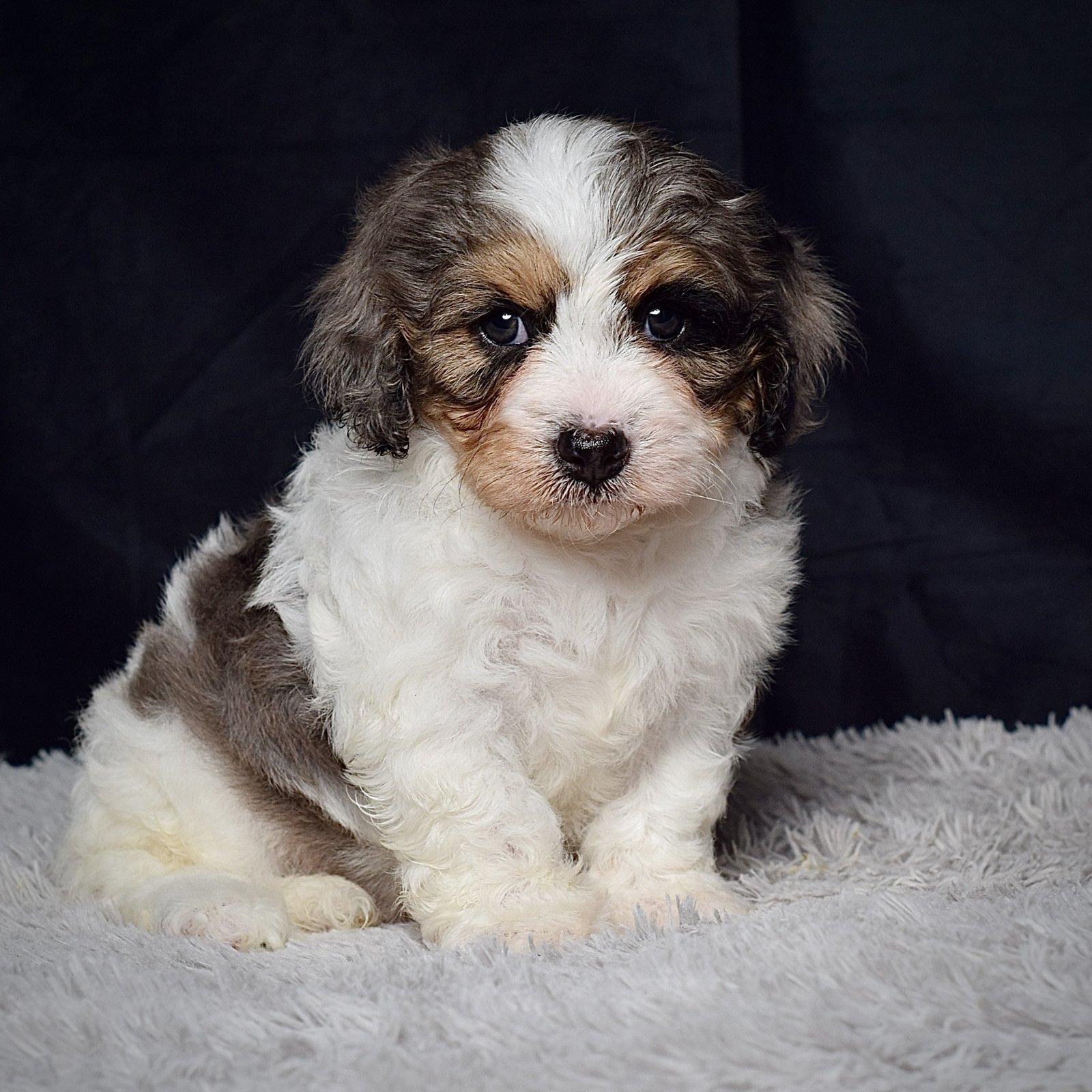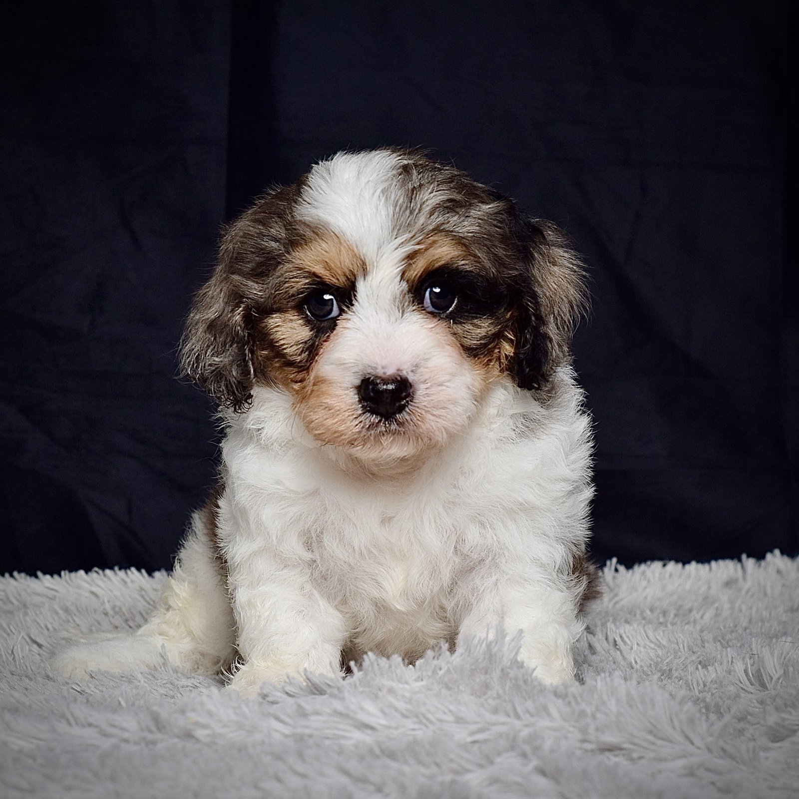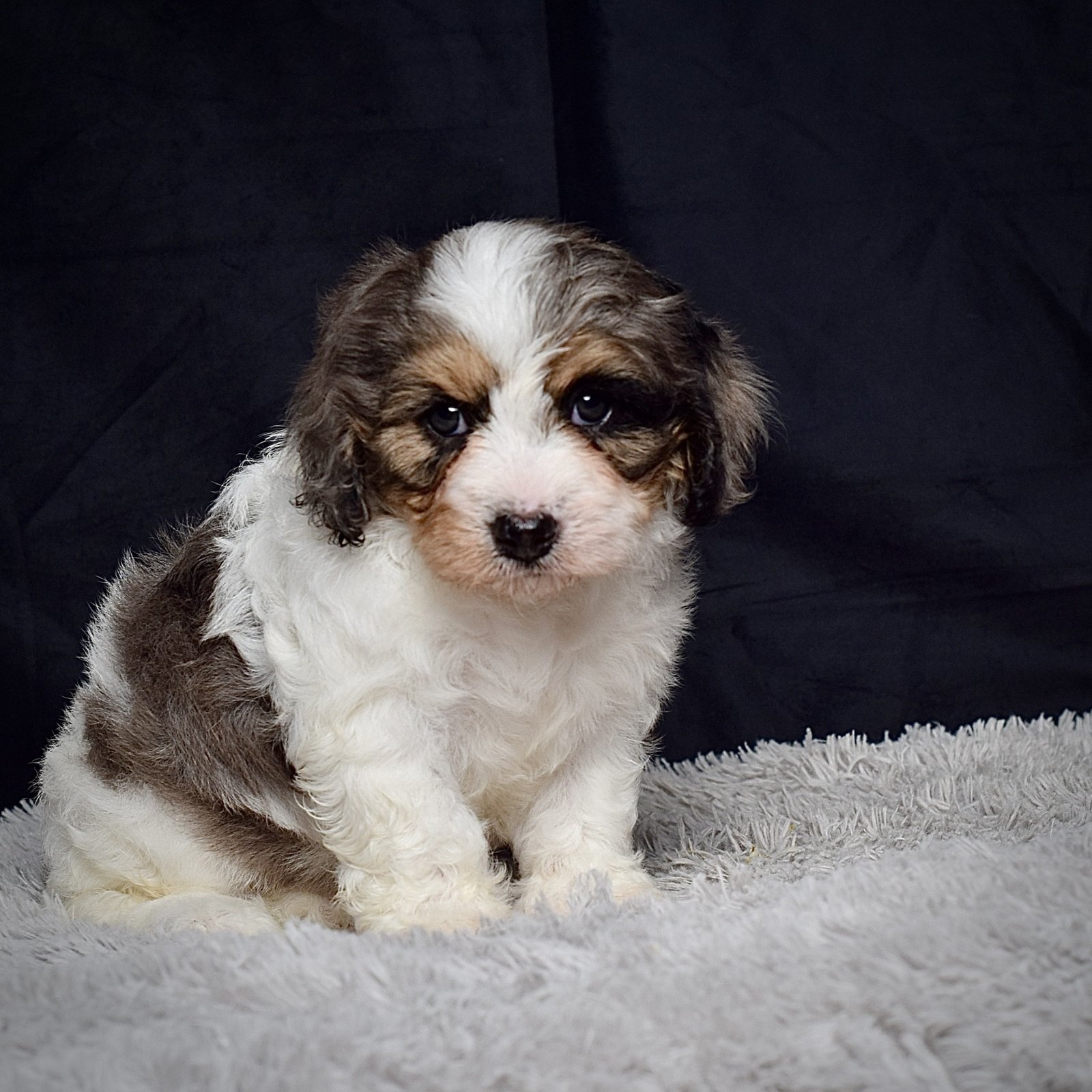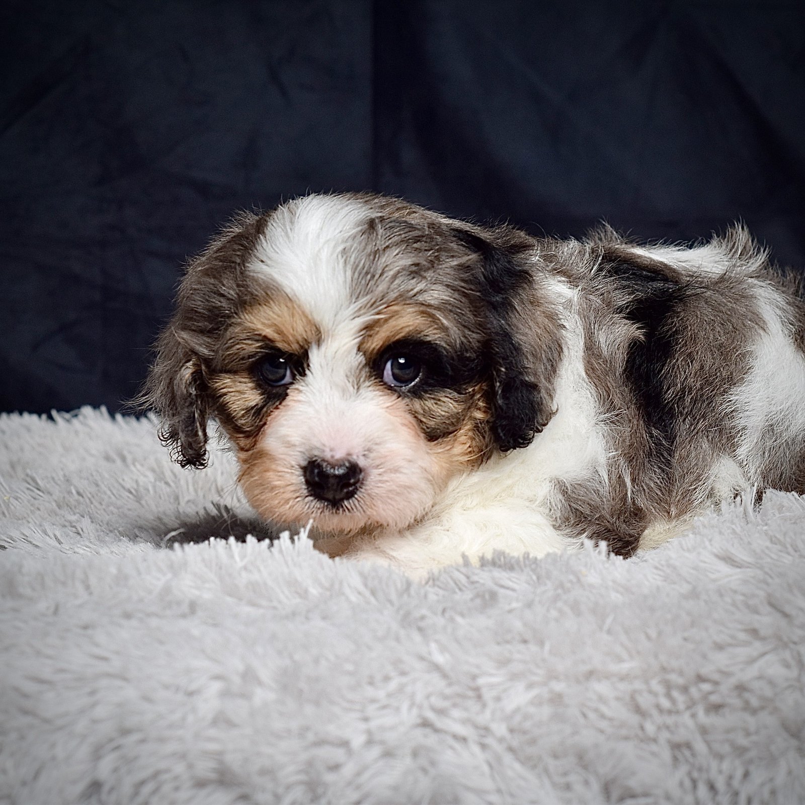 Meet this adorable petite mini Cavapoo, a tiny bundle of joy with a delightful personality and a coat as soft as a cloud. He blends the intelligence and hypoallergenic traits of a Poodle with the friendly nature and loyalty of a Cavalier , all in a compact package. His playful spirit and heartwarming charm make him the perfect companion for any household, promising endless love and happiness to those lucky enough to bring him home.