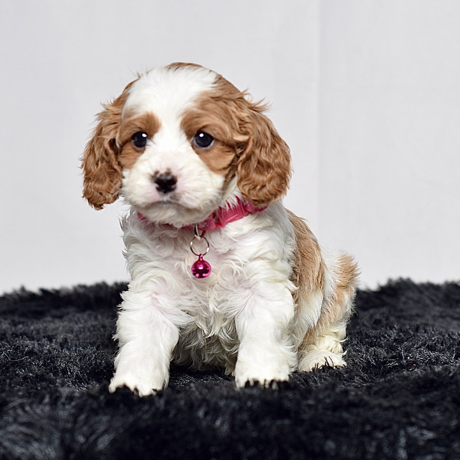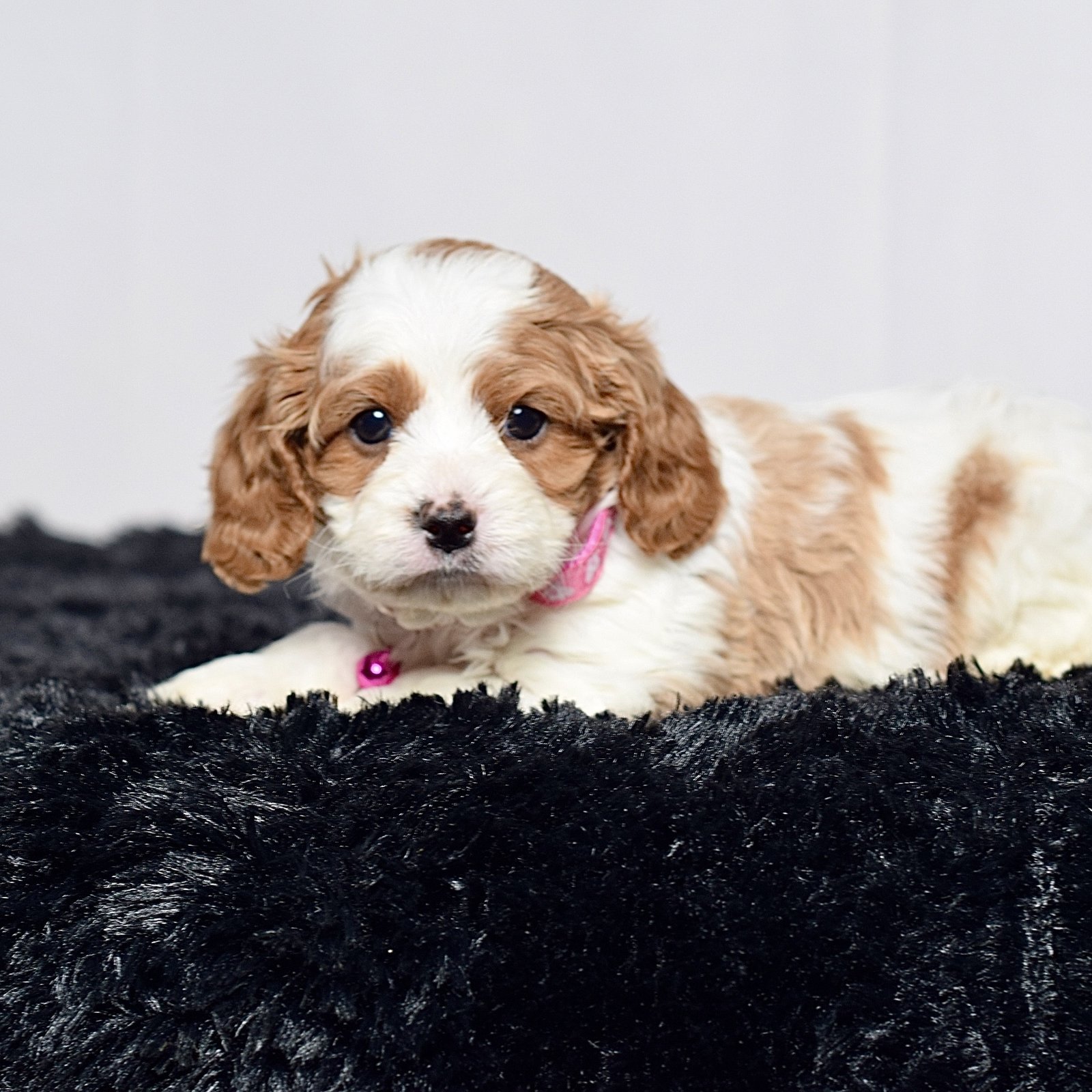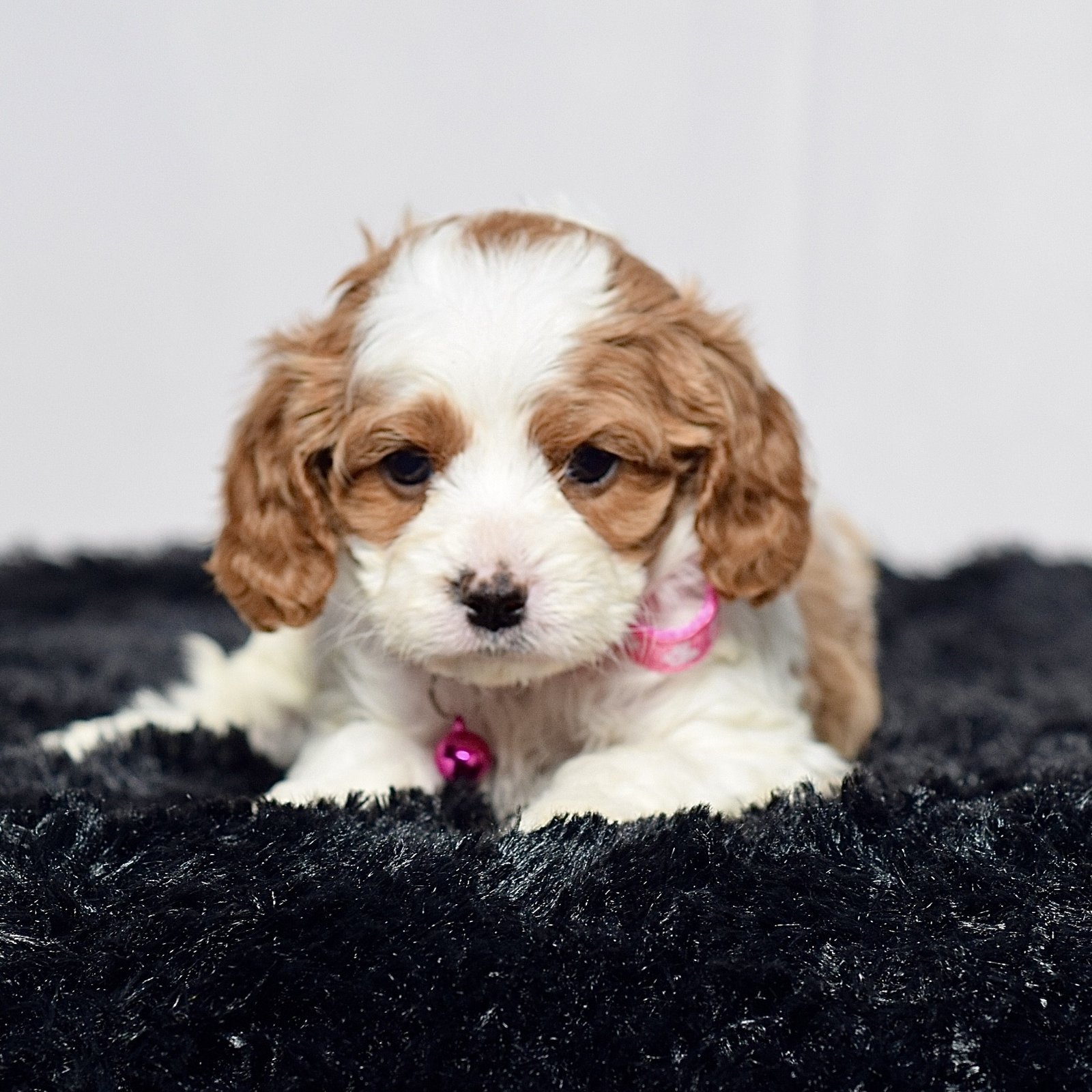 Meet this adorable mini Cavapoo, a tiny bundle of joy with a delightful personality and a coat as soft as a cloud. She blends the intelligence and hypoallergenic traits of a Poodle with the friendly nature and loyalty of cavalier, all in a compact package. Her playful spirit and heartwarming charm make her the perfect companion for any household, promising endless love and happiness to those lucky enough to bring her home.