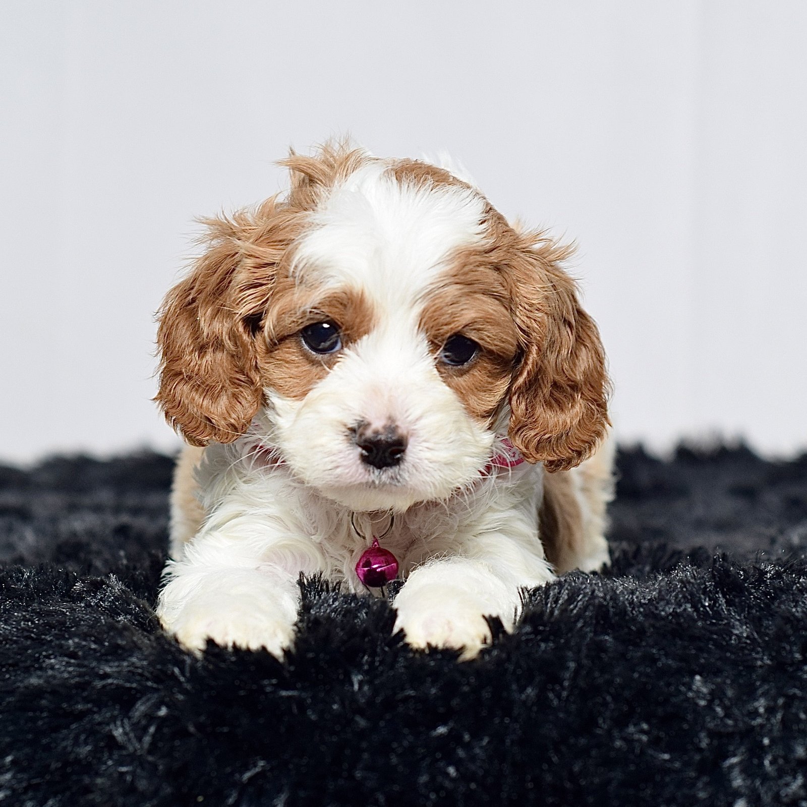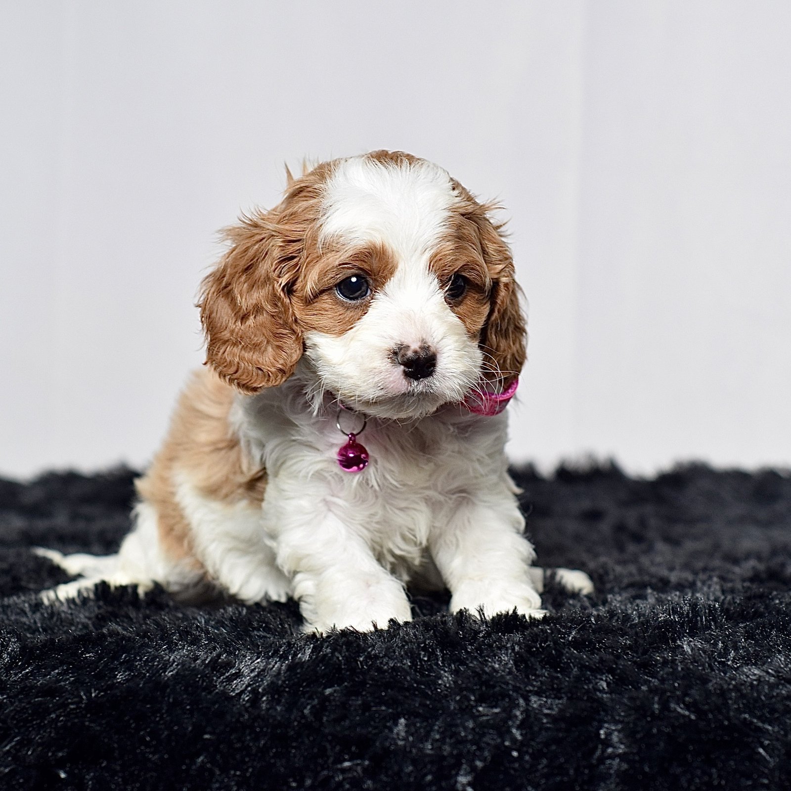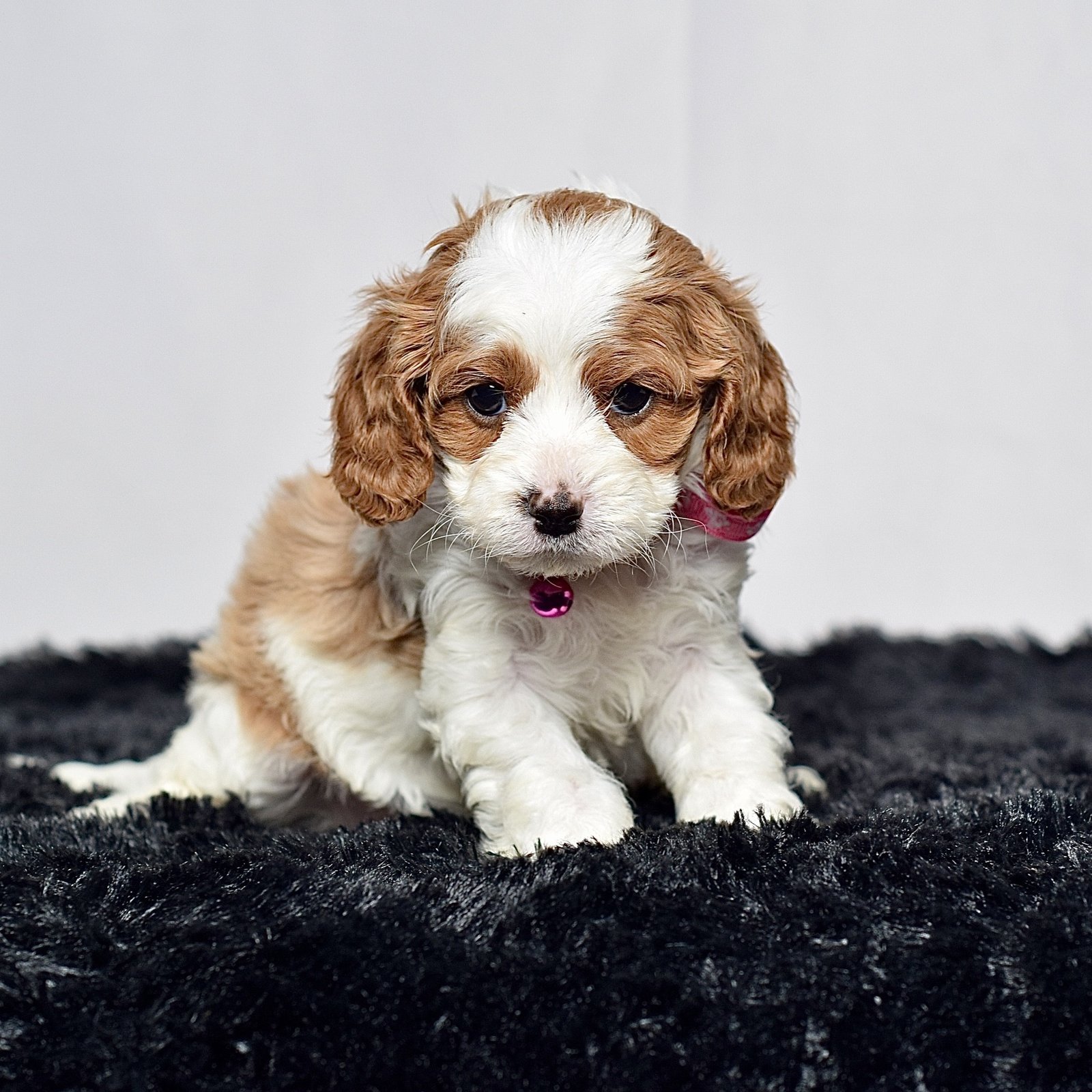 Meet this adorable mini Cavapoo, a tiny bundle of joy with a delightful personality and a coat as soft as a cloud. She blends the intelligence and hypoallergenic traits of a Poodle with the friendly nature and loyalty of cavalier, all in a compact package. Her playful spirit and heartwarming charm make her the perfect companion for any household, promising endless love and happiness to those lucky enough to bring her home.